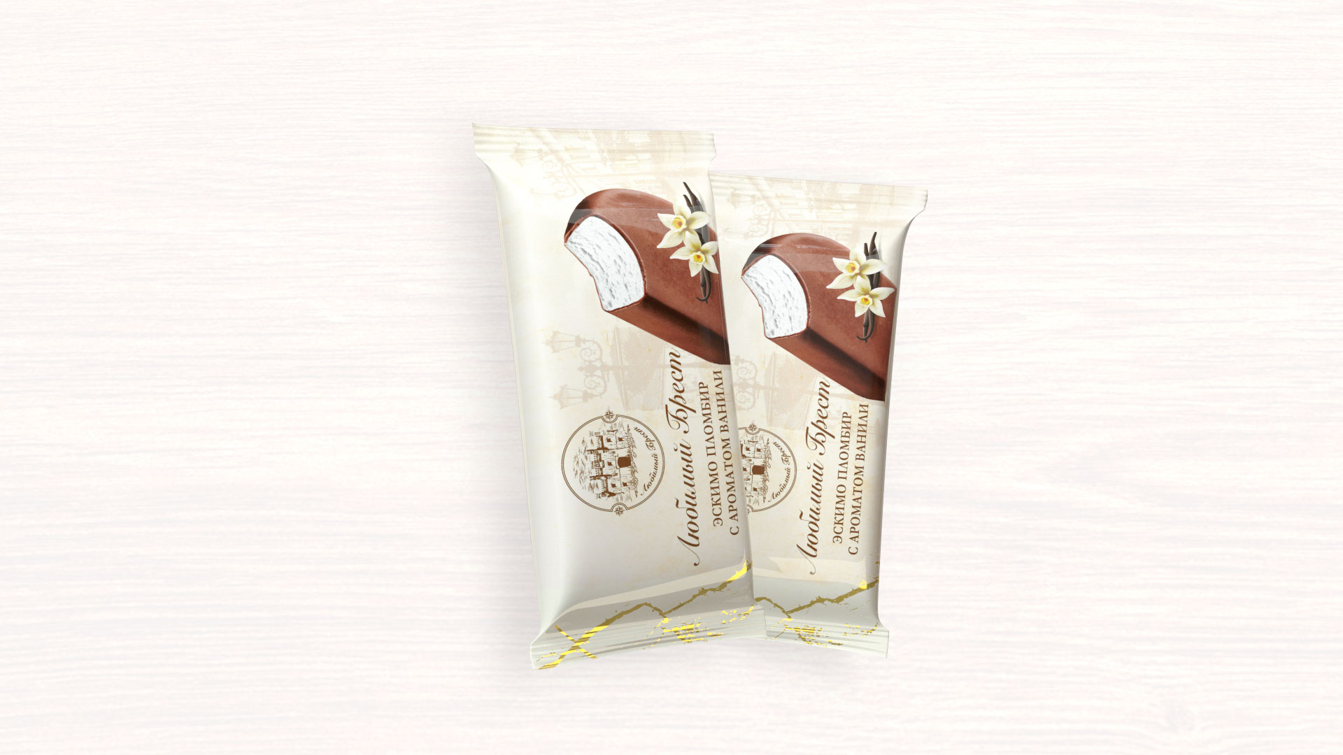 LYUBIMIY BREST ice cream is a classic vanilla sundae in chocolate glaze. Popsicle is one of the most popular frozen desserts with the classic creamy taste of ice cream wrapped in melting chocolate frosting. The product is made according to the traditional recipe from whole milk and cream.