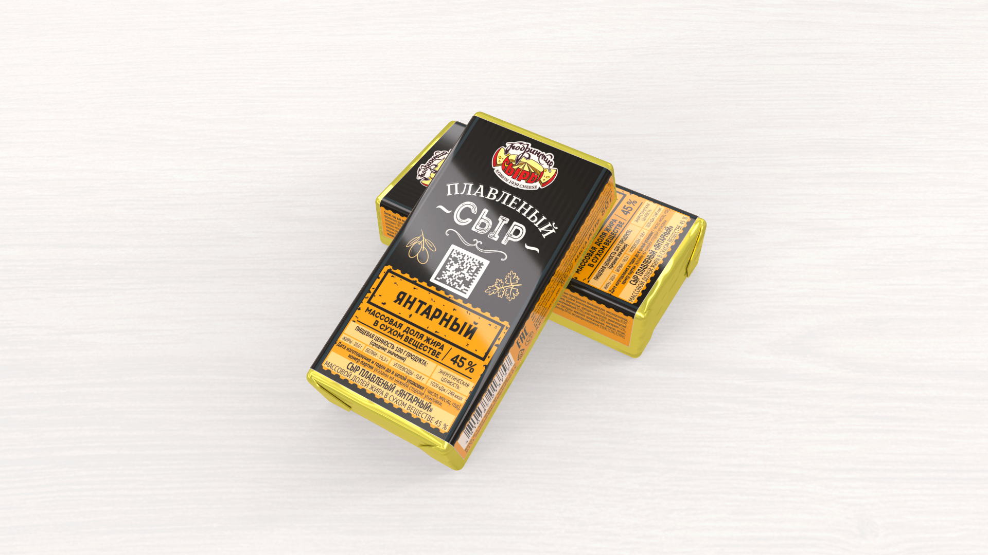 Processed "Amber" cheese with a mass fraction of fat in dry matter of 45% is a highly nutritious product, it is made from cheeses with a low temperature of second heating, butter, skimmed milk powder. The color of the dough : from light yellow to intense yellow, uniform throughout the mass, the consistency is moderately dense, slightly elastic, slightly plastic. Cheese belongs to the group of sliced processed cheeses, has a smearing consistency, a cheesy taste with a sour-milk aroma. The taste is pronounced cheesy, slightly sour. Yantarny cheese is intended for direct consumption, preparation of various sandwiches.